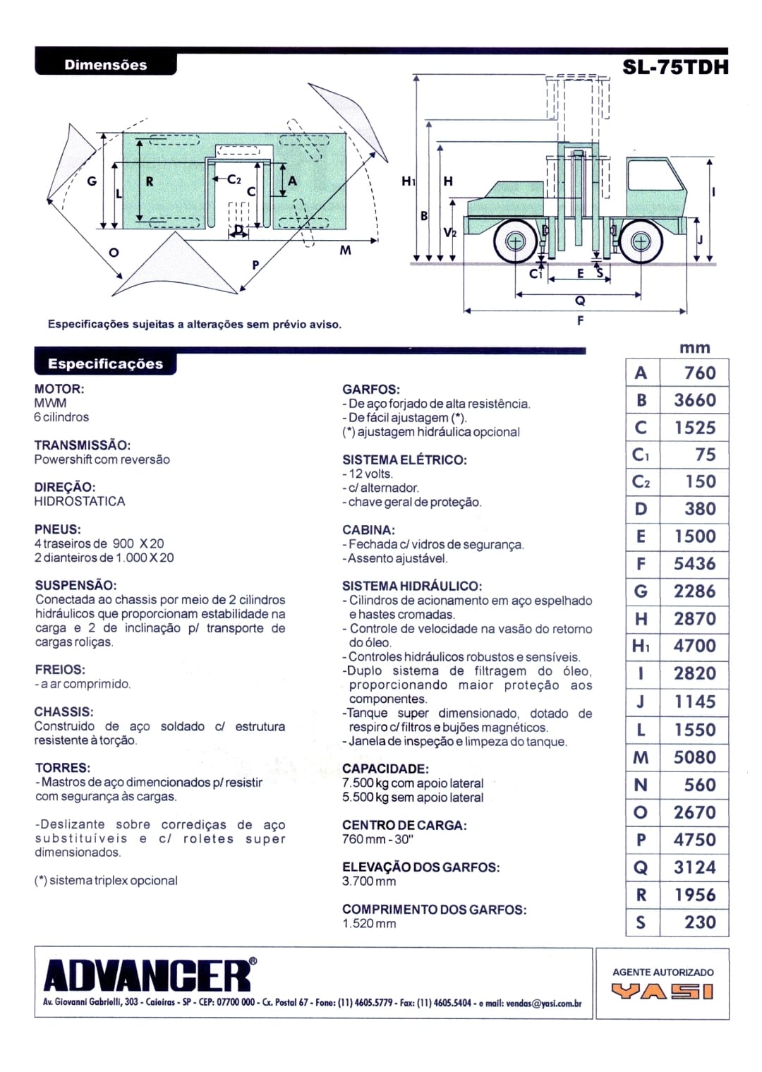 Código da peça SL75TD – Empilhadeira Lateral, Capac. 7.5 Ton, Movida A Diesel. Motor: Marca Mwm Diesel Modêlo D229/6. Transmissão: Power Shift, 3 Marchas A Frente E 3 A Ré. Direção: Hidrostática Atuando Nas Rodas Dianteiras. Pneus: Dianteiros: (2) 1.000 X 20 Traseiros: (4) 900 X 20. Suspensão: Eixo Traseiro Rígido (Diferencial), Eixo Dianteiro Basculante Pivotado No Centro. Duas Sapatas De Apoio Acionadas Hidraulicamente. Freios: Tipo Patins/Tambor Acionados A Ar Comprimido. Freio De Estacionamento Aplicado Por Ar Comprimido. Chassis: Construido De Aço Soldado Com Estrutura Resistente A Torção. Torre: Mastro De Aço Dimencionado Para Resistir Com Segurança Às Cargas. Deslizante Sobre Corrediças De Aço Substituíveis E Com Roletes Super Dimensionados. Deslizante Sobre Corrediças De Aço Substituíveis E Com Roletes Super Dimensionados. Garfos: De Aço Soldado De Alta Resistencia. De Fácil Ajustagem. Sistema Elétrico: 12 Volts, Com Alternador De 65A, Com Chave Geral De Proteção, Lanterna, Farois Dianteiros E Traseiros, Luzes Direcionais, Luzes De Freio, Farol Para A Carga, Buzina, Limpador De Parabrisa, Ventilador De Cabine, Aviso Sonoro De Ré, Indicador Luminoso Rotativo, Proteção Contra Partidas Com As Sapatas Acionadas. Cabina: Fechada Com Vidros De Segurança, Assento Anatômico Regulável, Amplo Retrovisor Do Lado Esquerdo. Sistema Hidráulico: Cilindros De Acionamento Em Aço Espelhado E Hastes Cromadas. Controles Hidráulicos Robustos E Sensíveis, Duplo Sistema De Filtragem De Óleo. Proporcionando Maior Proteção Aos Componentes. Tanque Super Dimencionado, Dotado De Respiro Com Filtros E Bujões Magnéticos.Janela De Inspeção E Limpeza Do Tanque. Capacidade: 7500Kg Com Apoio Lateral Das Sapatas. Altura De Elevação: 3800 Mm. Centro De Carga: 760Mm”, o prazo de entrega de 45 dias + equipamento revisado, pintado, em condições de trabalho.